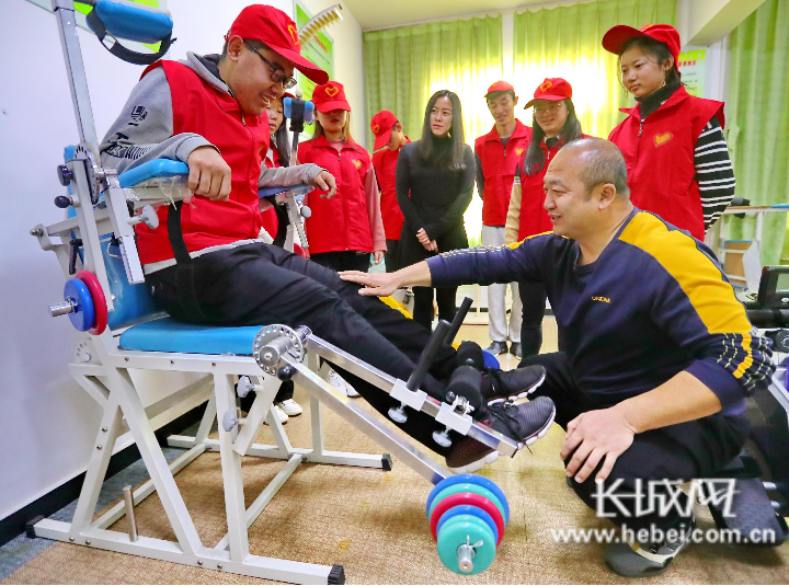大学生志愿者体验残障人士使用的康复器材。曹建雄摄