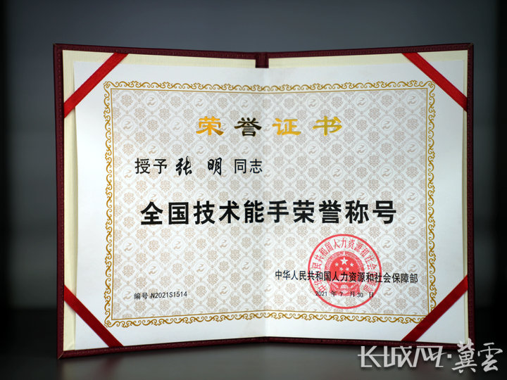 张明获得的“全国技术能手”荣誉证书。郭政 摄