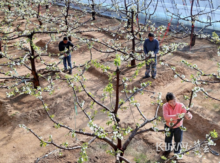 长城网·冀云客户端讯(通讯员 曹建雄)1月15日,秦皇岛市海港区北港镇木咋峪村的六必顺大樱桃种植农民合作社,果农们正在管护着大樱桃树,大棚内一派人勤春早的繁忙景象。
