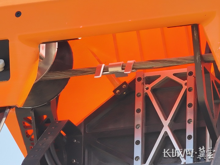 作业过程中,工作人员先使用大型无人机将断股修补机器人吊运至数十米高空的缺陷点位,随后通过远程遥控,指挥机器人精准夹持并安装金属卡箍,完成修复。