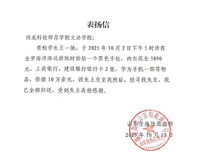 10月15日,河北科技师范学院收到秦皇岛市海港区山东堡海防派出所民警专程送来的一封表扬信,为文法学院2022级法学专业王一驰同学拾金不昧的暖心举动郑重“点赞”。