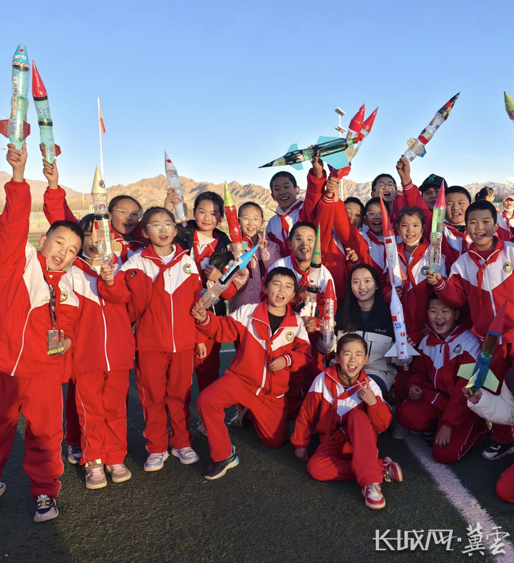 青海省德令哈市长江路小学师生在“水火箭”制作比赛结束后合影。通讯员 供图