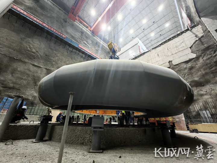 座环蜗壳正在缓缓下落。郭政 摄