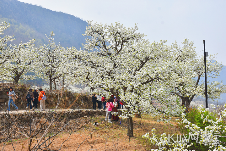 官场乡梨树种植历史悠久,目前拥有盛果期梨树1.6万亩,其中百年以上老树达5000棵。层层梯田之上,梨花缀满枝头,与远处蜿蜒的明长城遗址交相辉映,构成一幅春日独有的画卷。