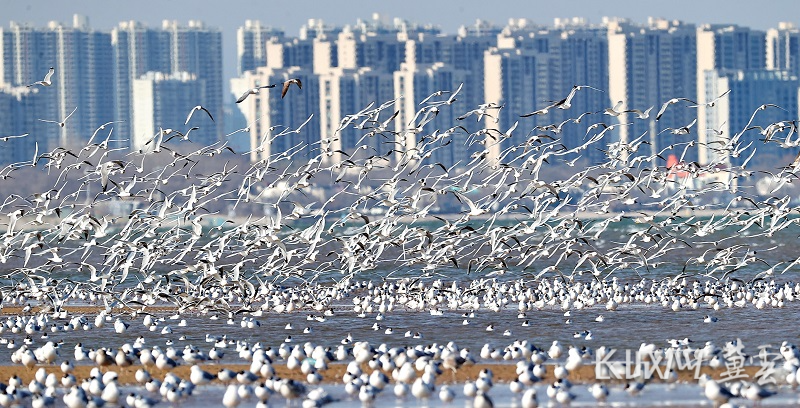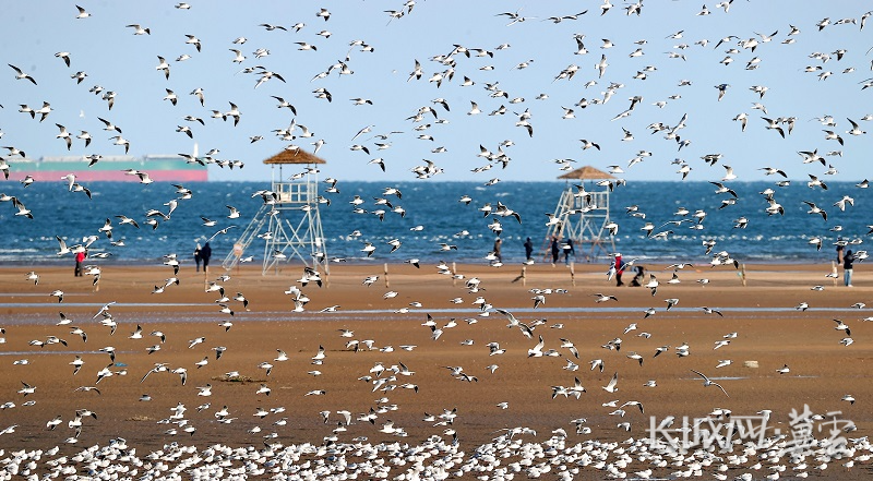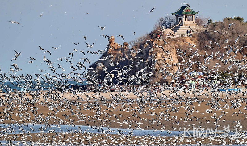 4月7日,成群鸥鸟在秦皇岛北戴河鸽子窝公园附近海域飞翔。曹建雄 摄